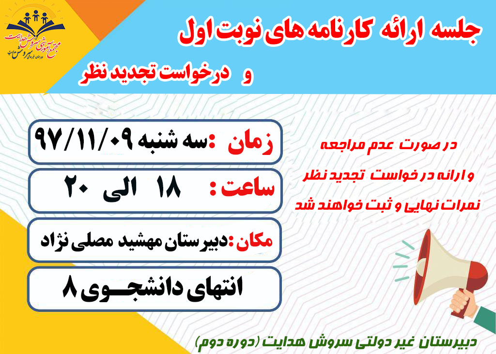 جلسه ارائه کارنامه های نوبت اول و درخواست تجدید نظر روز سه شنبه 97/9/11 از ساعت 18 الی 20 در دبیرستان مهشید مصلی نژاد انتهای دانشجوی 8 - با تشکر دبیرستان دوره دوم سروش هدایت